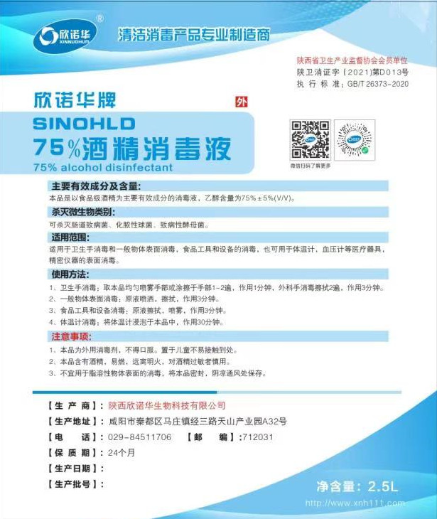欣諾華牌75%酒精消毒液2.5L使用說明書