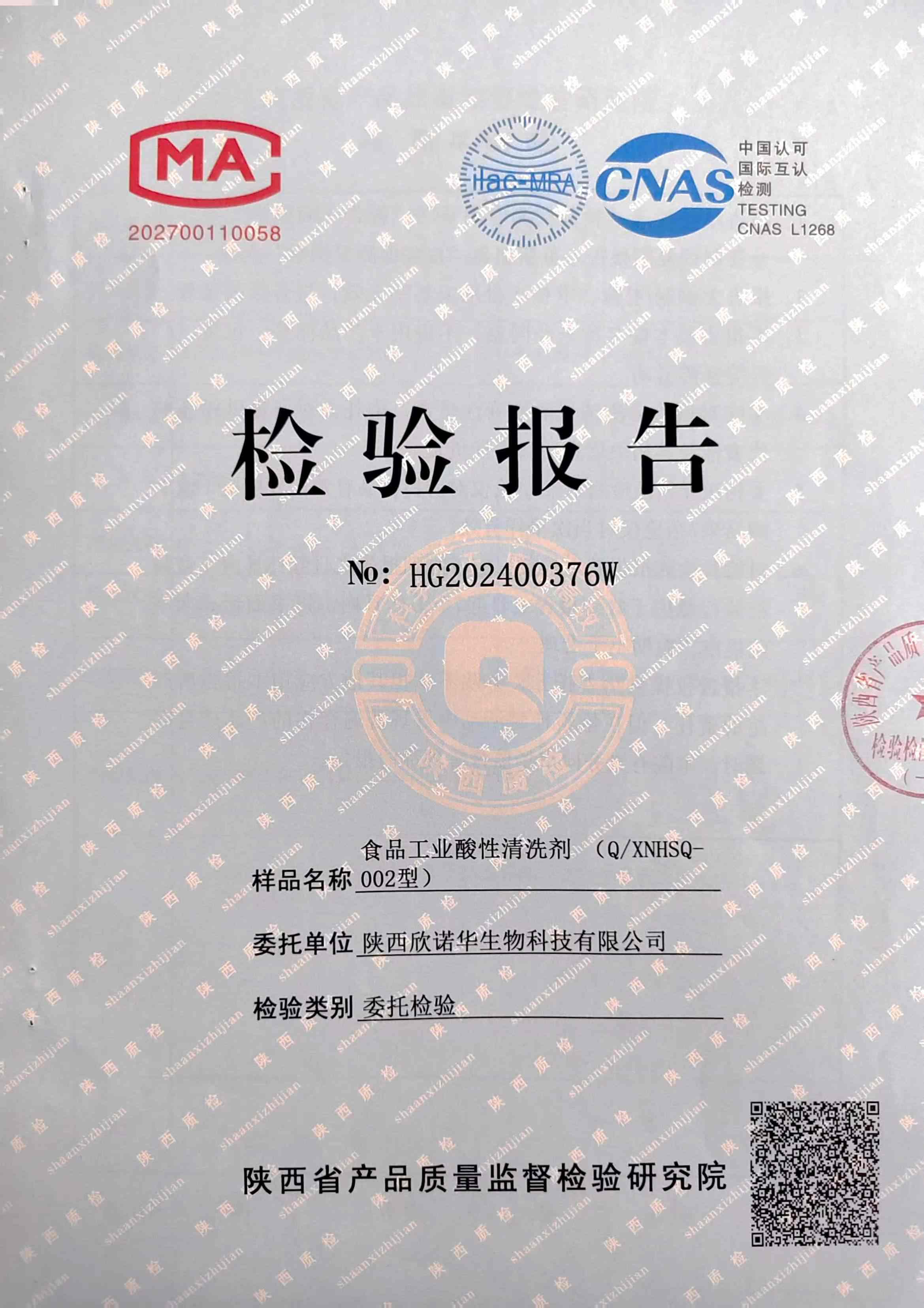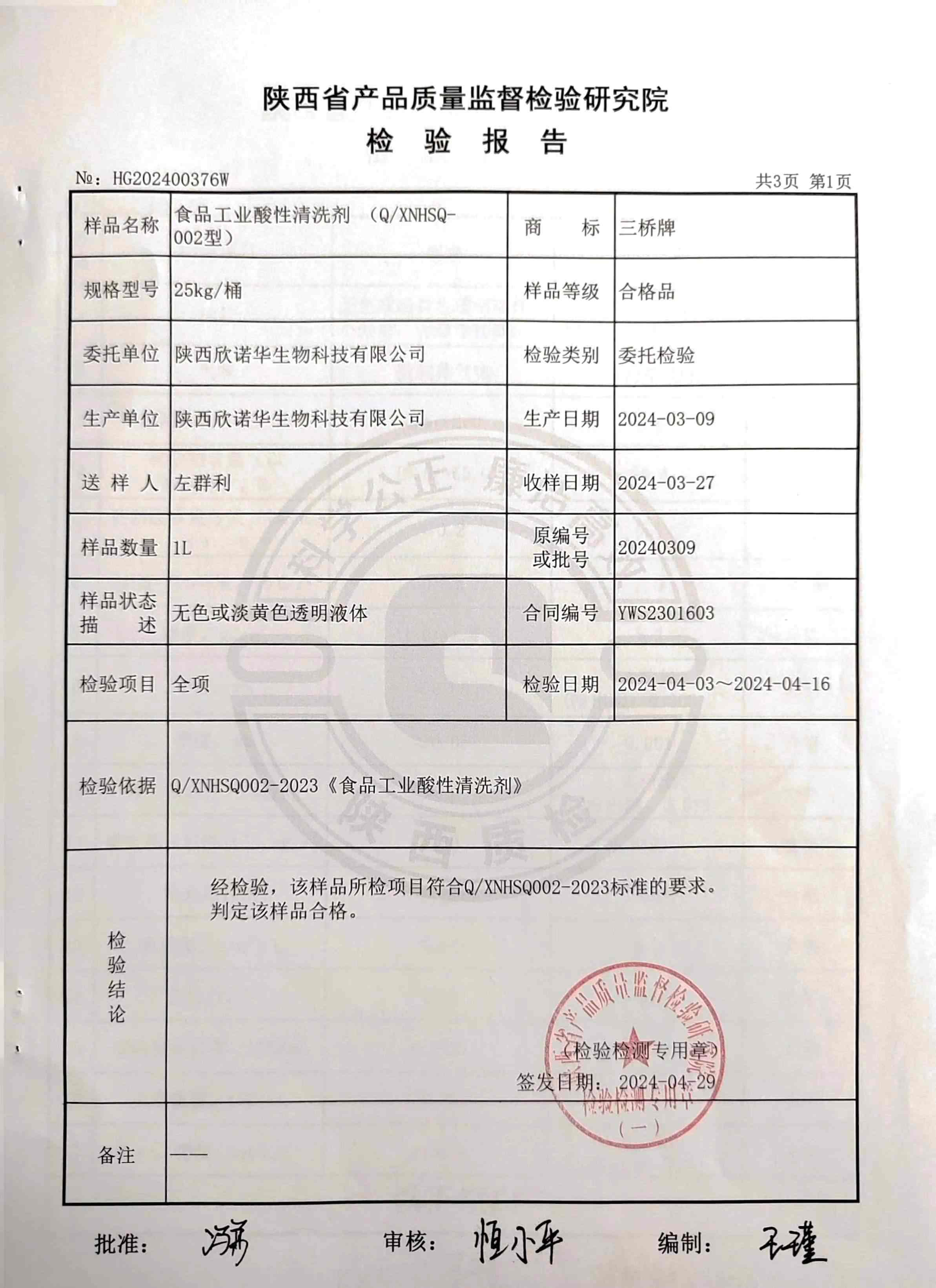 三橋牌食品工業(yè)酸性清洗劑XNHSQ-2檢測(cè)報(bào)告(2024年度)-陜西欣諾華生物科技有限公司