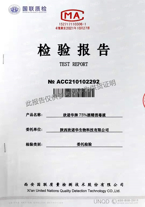 欣諾華牌75%酒精消毒液 檢測(cè)報(bào)告(2021年度)-陜西欣諾華生物科技有限公司
