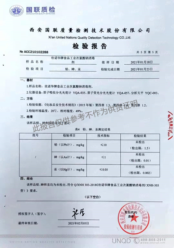 欣諾華牌食品級(jí)次氯酸鈉消毒劑檢測(cè)報(bào)告(XNH303型)(2021年度)-陜西欣諾華生物科技有限公司