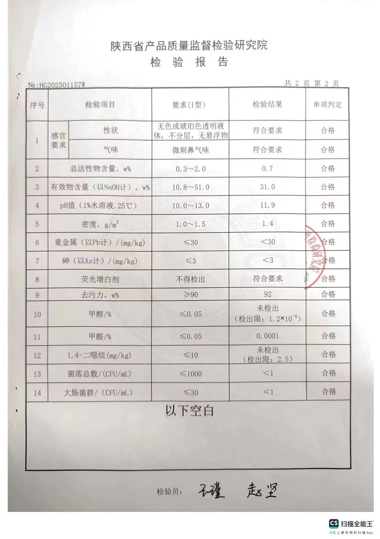 食品工業(yè)堿性清洗劑檢測報告(2023年度)-陜西欣諾華生物科技有限公司