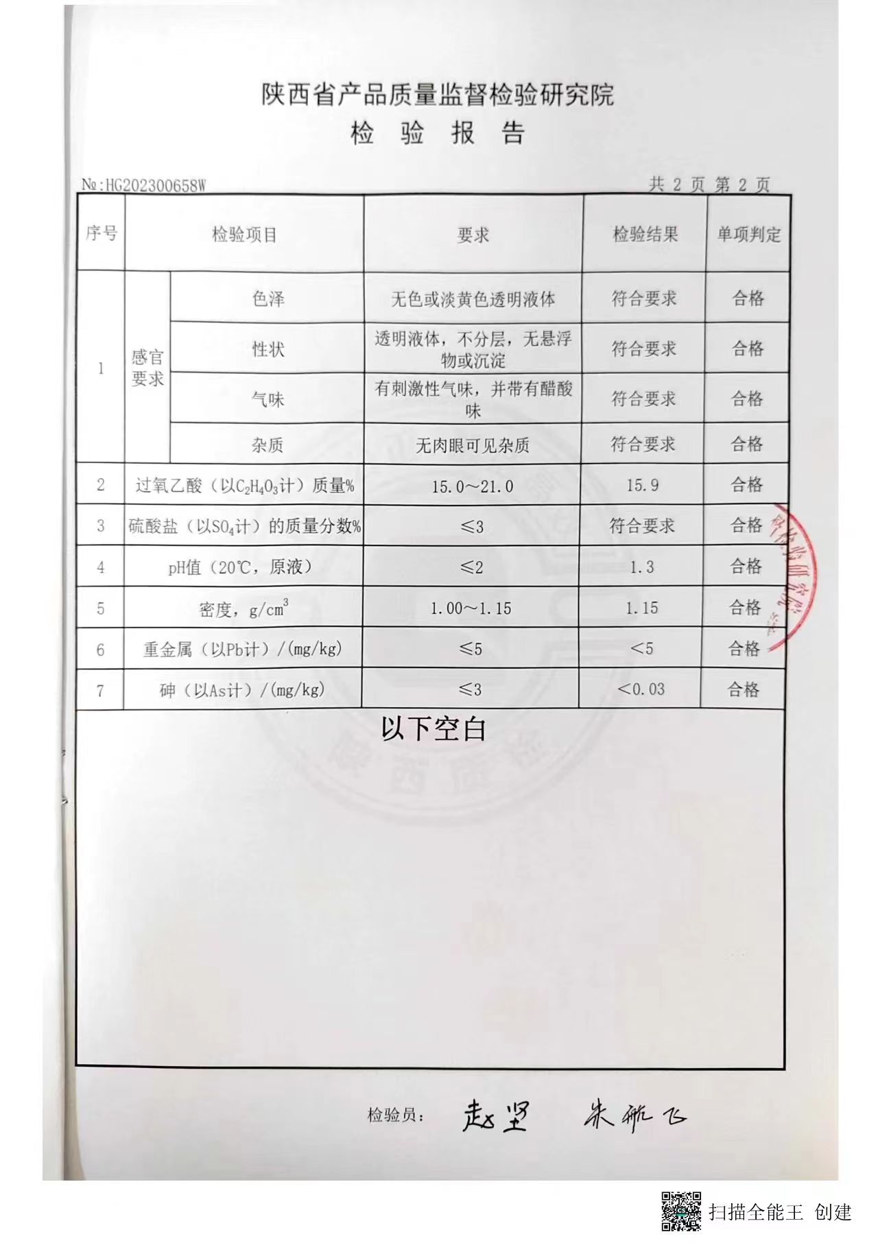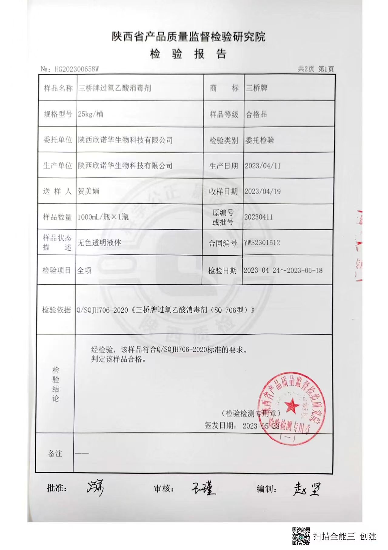 三橋牌過(guò)氧乙酸消毒液第三方檢測(cè)報(bào)告(2023年度)-陜西欣諾華生物科技有限公司